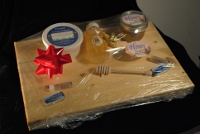 Our standard gift package includes our Midnight Sun honey in a honey bear, a half-pint of honey and comb, and also a tub of creamed honey. We also include a dipper, Sarah's Lip Lather and Sarah's Slope Salve. All of these are laid out on one of our hand-crafted cutting boards, made with our own Beeswax Wood Finish.